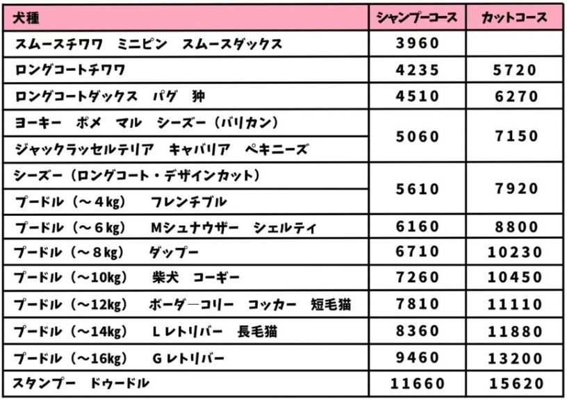 | 中型犬~5点セット(爪切り、耳掃除、足裏バリカン(足まわりカット)、肛門バリカン、肛門腺) | ¥2400 |